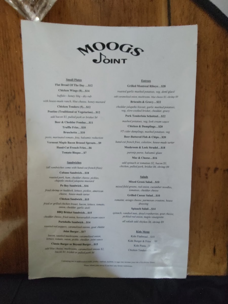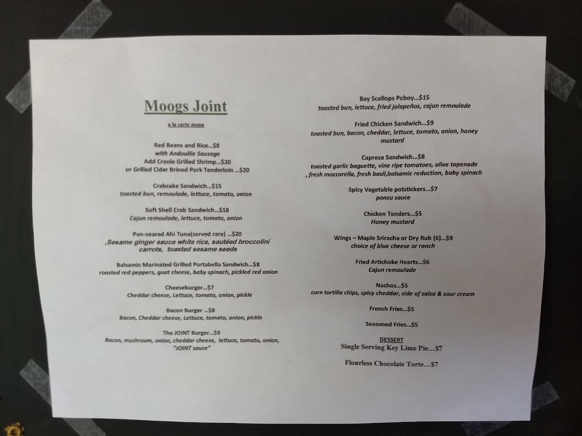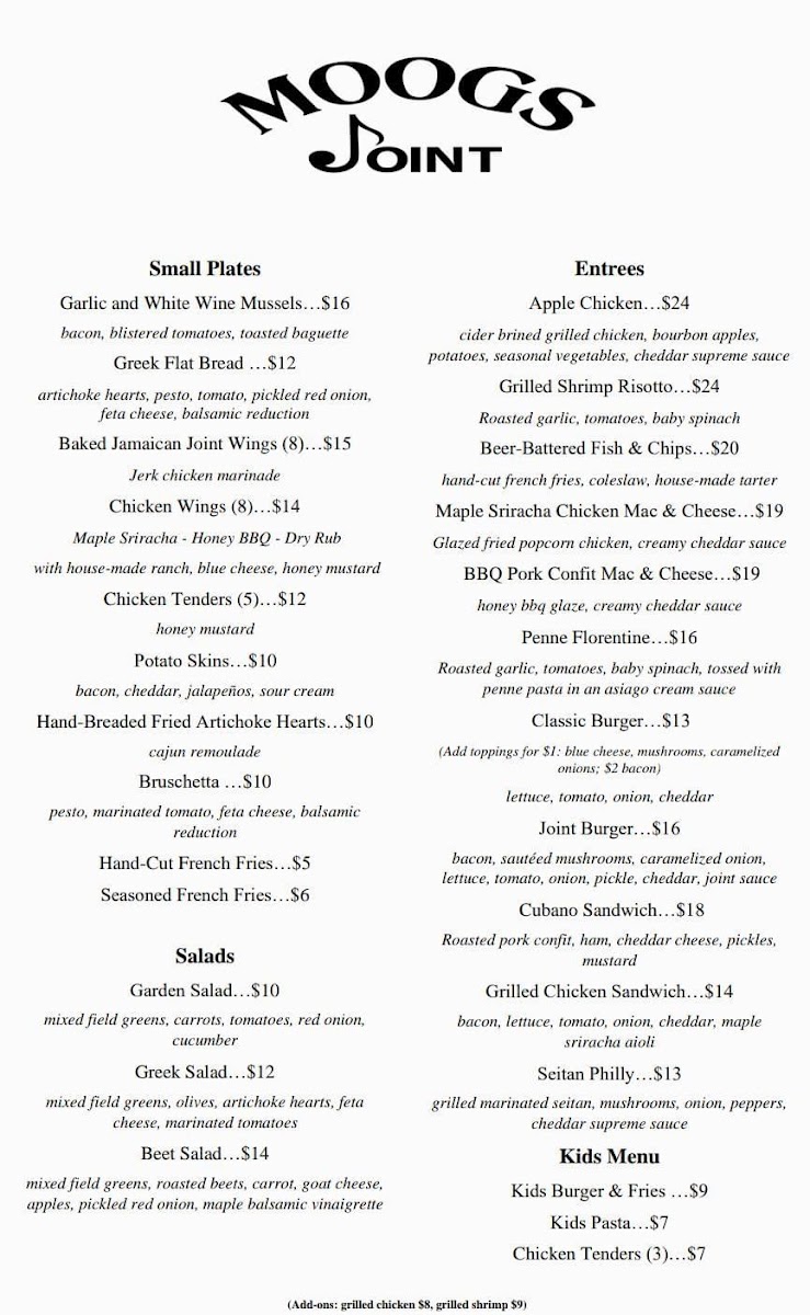 Moog's Joint offers a diverse menu with something for everyone, whether you're in the mood for a small bite or a hearty meal. Their small plates, like Flat Bread Of The Day and Chicken Wings, offer a great start to any meal, while the Beer & Cheddar Fondue and Bruschetta are perfect for sharing. For lighter fare, the Mixed Green Salad or Grilled Caesar Salad are fresh and satisfying. Entrees include delicious options such as the flavorful Apple Chicken, Grilled Shrimp Risotto, and the crispy Beer-Battered Fish & Chips. The Maple Sriracha Chicken Mac & Cheese and BBQ Pork Confit Mac & Cheese are standouts for comfort food lovers. The kids’ menu features simple favorites like Kids Burger & Fries and Chicken Tenders. Sandwich lovers can enjoy the Cubano Sandwich or Po Boy Sandwich, while those seeking something a little different can try the Bbq Brisket Sandwich or Mac & Cheese. For an extra treat, the Soft Shell Crab Sandwich or Pan-Seared Ahi Tuna from the a la carte menu add unique flavors. Don't forget to save room for dessert, with options like the Single Serving Key Lime Pie or the rich Flourless Chocolate Torte. To wash it all down, Moog's Joint offers a variety of cocktails and elixirs, including the refreshing Blackberry Bramble and the tropical BeeFoote Brook Rum Punch. The restaurant’s menu combines classic comfort with creative twists, offering a memorable dining experience for any occasion.